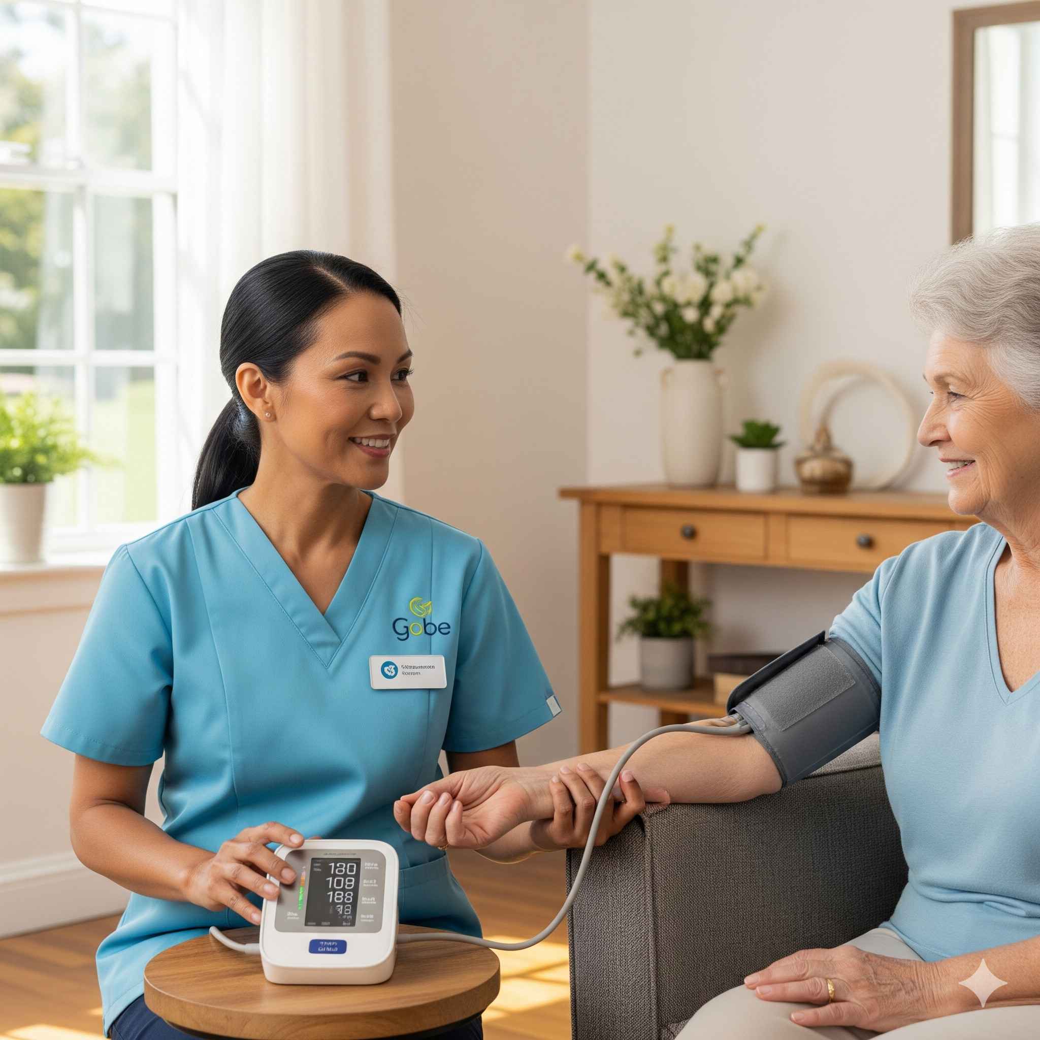 - Theo dõi sức khỏe: Đo huyết áp, nhiệt độ, theo dõi các chỉ số sức khỏe thường xuyên, ghi chép và báo cáo cho gia đình và bác sĩ